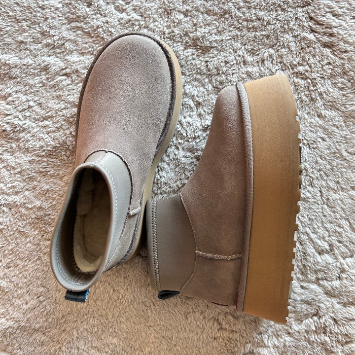 • Contrafforte in camoscio, tirante posteriore in fibre di poliestere riciclato (100%), mascherina in camoscio, gambale in neoprene, fodera della mascherina in UGGplush™, realizzata con lana rigenerata (60%) e lyocell TENCEL™ (40%)